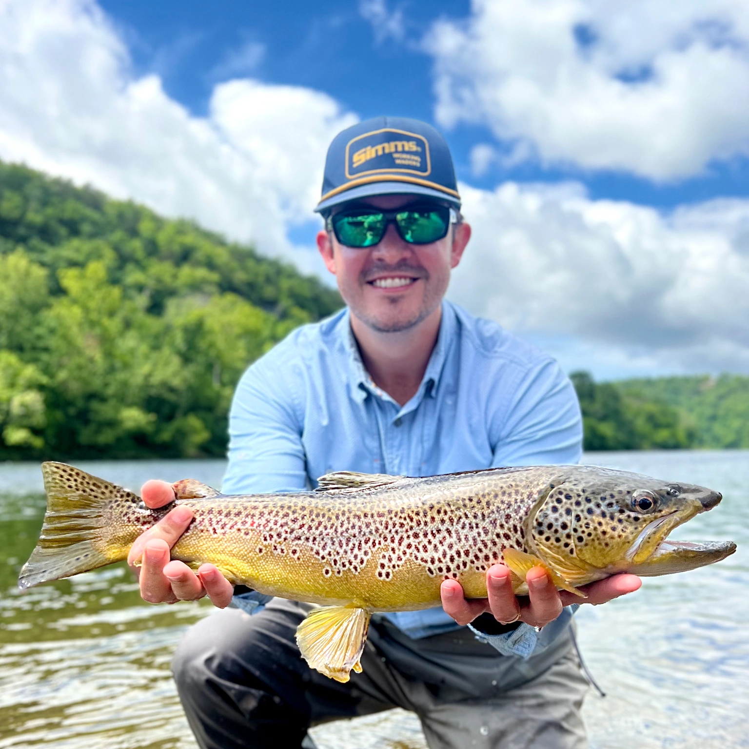 Female fly fishing angler holding a Brown Trout on the White River.